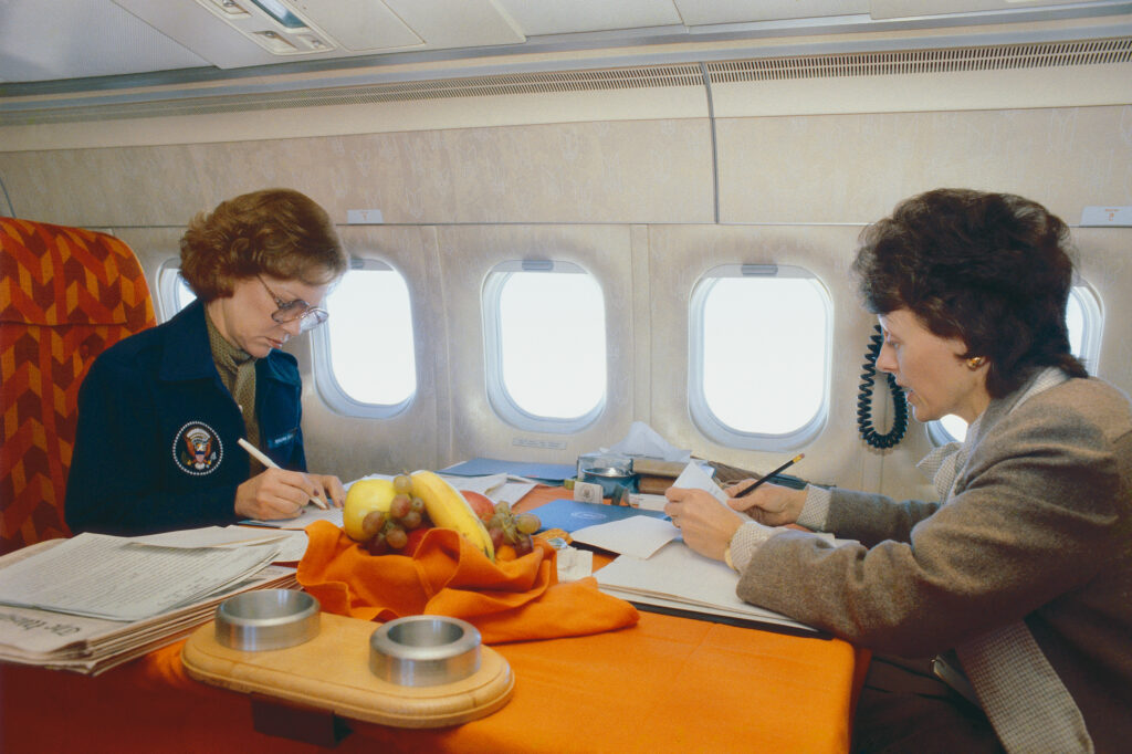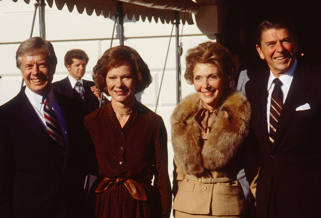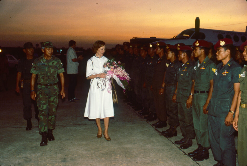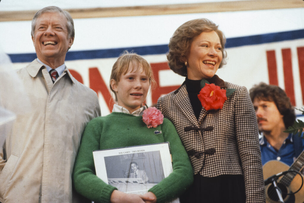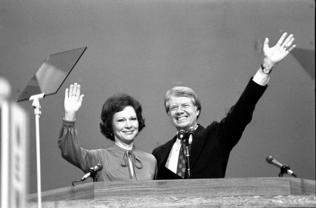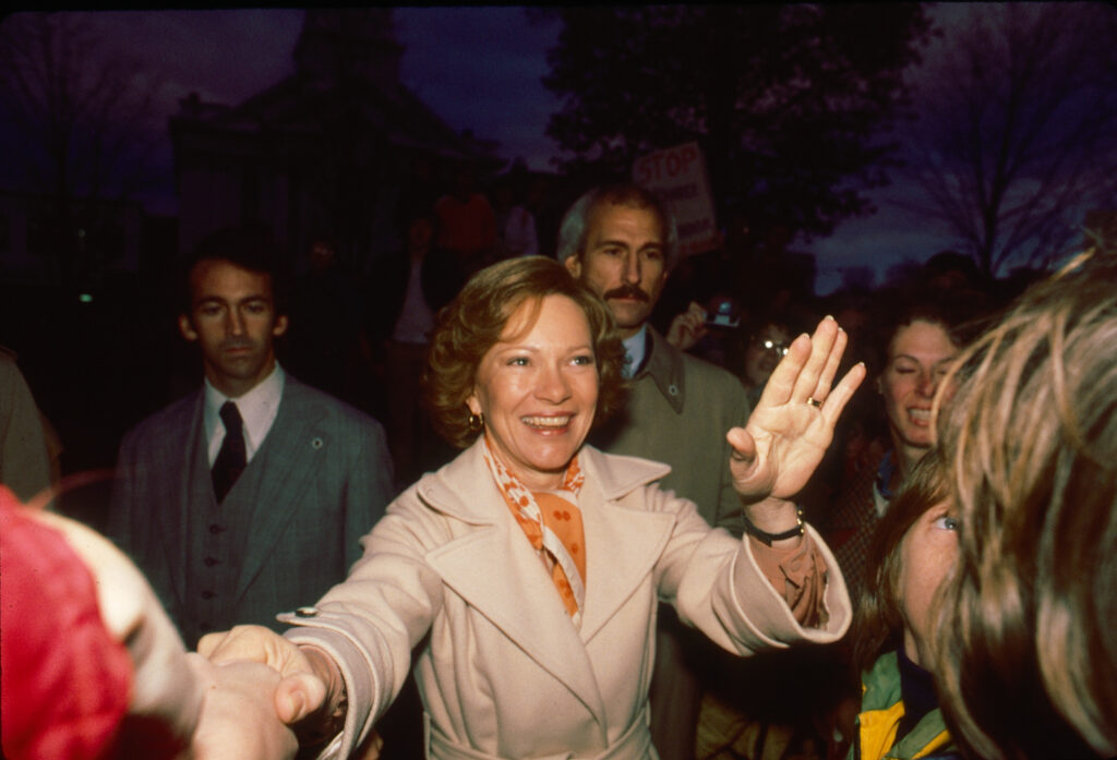 The Carters embrace each other after hearing news of his victory in the presidential election, Nov. 2, 1976. (Photo: Hulton Archive/Getty Images).Rosalynn shaking hands at a campaign event in New Hampshire, Oct. 24, 1979. (Photo: Diana Walker/Getty Images). Jimmy and Rosalynn Carter waving after accepting his party’s nomination for president. (Photo: Shepard Sherbell/Corbis via Getty Images). First Lady Rosalynn Carter and Second Lady Joan Mondale working at a table on an airplane to Iowa for an appearance for their husbands’ reelection campaigns in 1980. (Photo: Diana Walker/ Getty Images). The Carter family in 1977. Left to right: Judy (Mrs. Jack Carter); Jason James Carter; Jack (John William Carter); Annette (Mrs. Jeff Carter); Jeff (Donnel Jeffrey Carter); first lady Rosalynn Carter; daughter Amy Lynn Carter; President Carter; daughter-in law Caron Griffin Carter holding James Earl Carter IV; and son Chip (James Earl Carter III). (Photo: CORBIS/Getty Images).Jimmy and Rosalynn Carter and their daughter Amy wave to crowd at the 1980 Democratic National Convention. (Photo by Bettmann/Getty Images). First Lady Rosalynn plays basketball with the Harlem Globetrotters in March 1980. (Photo: Diana Walker/ Getty Images). Jimmy and Rosalynn Carter with their daughter in hometown Plains, Georgia in January 1981. (Photo: Chuck Fishman/Getty Images).President Carter being interview by the press on Air Force One with Rosalynn by his side (Photo: Bettmann/Getty Images). President Carter kissing Rossalyn after announcing re-election on December 4, 1979. (Photo: Diana Walker/Getty Images).Presidential candidate at the Baptist church in their hometown, Plains, Georgia, in 1976. (Photo: Michael Brennan/Getty Images). Rosalynn welcomed by the US first lady Rosalynn Carter by members of the Thai military Nov. 7, 1979. (Photo: Diana Walker/Getty Images).Outgoing President Jimmy Carter and first lady Rosalynn Carter with President-Elect Ronald Reagan and future first lady Nancy Reagan. (Photo: Diana Walker/Getty Images).Rosalynn Carter at Habitat for Humanity on June 23, 2005. (Photo: R. Diamond/Getty Images).Jimmy and Rosalynn Carter attend the funeral service for former US President George H. W. Bush at the National Cathedral in Washington, D.C., on Dec. 5, 2018. (Photo: MANDEL NGAN/AFP via Getty Images).Jimmy and Rossalyn Carter at the DNC in Boston, Mass., on July 26, 2004. (Photo: Scott Olson/Getty Images).
